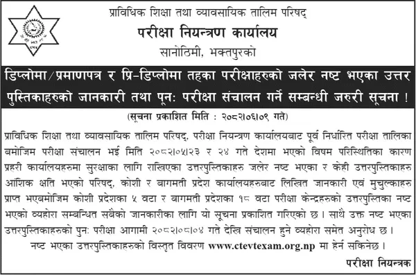 The Council for Technical Education and Vocational Training (CTEVT), Examination Control Office, Sanothimi, Bhaktapur, has issued an important notice regarding the destruction of answer sheets and the upcoming re-examinations.