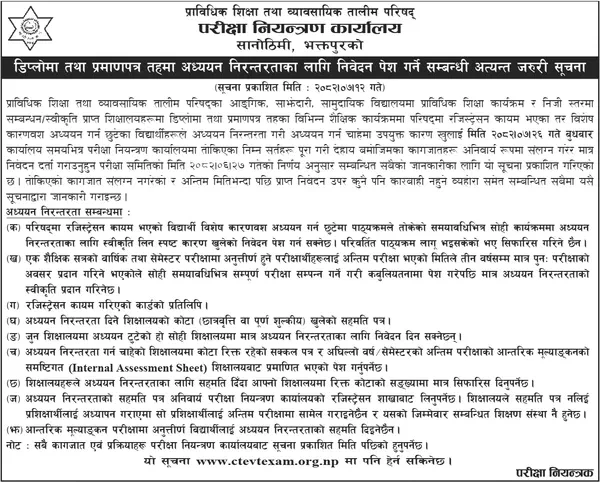 The Council for Technical Education and Vocational Training (CTEVT), Office of the Controller of Examinations, Sanothimi, Bhaktapur, has published an urgent notice regarding the submission of applications for study continuation at the Diploma and Certificate levels.