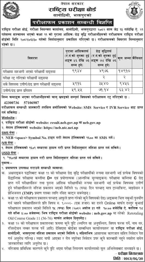 National Examination Board (NEB), Sanothimi, Bhaktapur has officially announced the Class 11 Partial and Grade Increment Examination Result 2082. The examination was conducted from 13th Jestha to 21st Jestha 2082 by the Examination Control Office, Sanothimi.