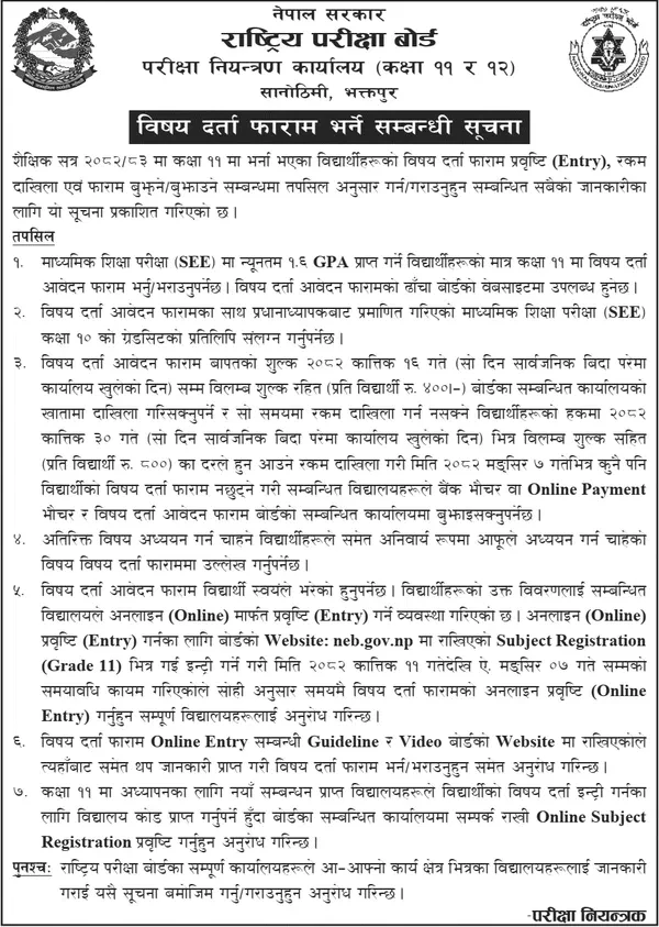 The Government of Nepal, National Examination Board (NEB) — Examination Control Office (Class 11 and 12), Sanothimi, Bhaktapur, has officially released a notice regarding Grade 11 Subject Registration for the academic session 2082/83.