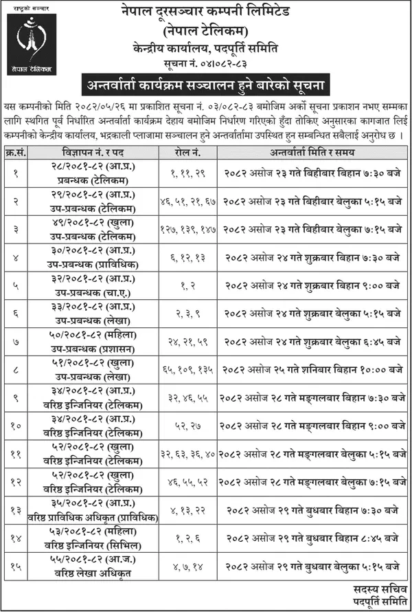The Nepal Telecom, Central Office, Recruitment Committee has published the updated interview schedule as per Notice No. 03/082-83 (originally published on 2082/05/26).