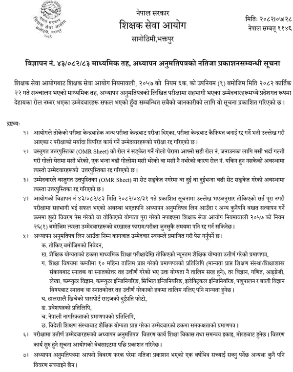The Teachers Service Commission (TSC – Shikshak Sewa Aayog) has officially published the Secondary (MaVi) Level Teaching License Written Exam Result 2082, held on Kartik 22, 2082. The results have been released according to Rule 6Ka (1) of the Teachers Service Commission Regulation, 2057.
