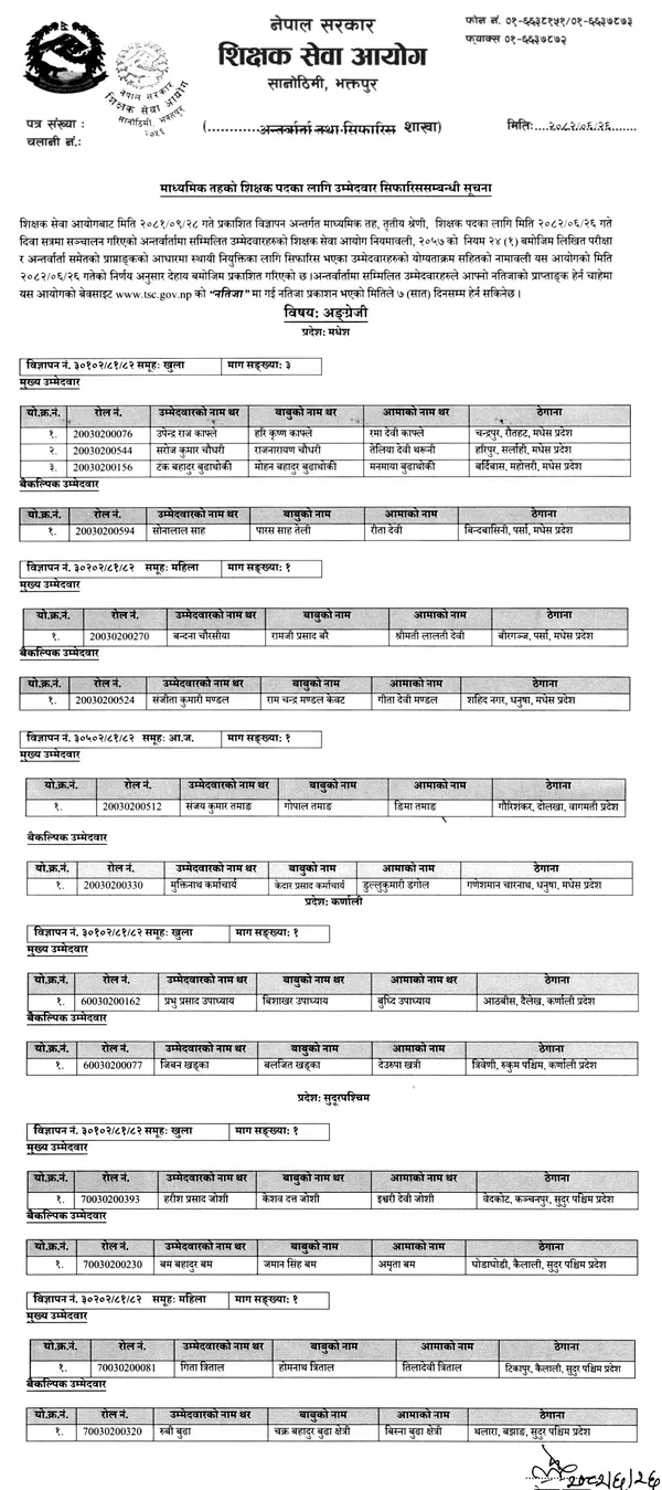 The Teacher Service Commission (TSC), Government of Nepal, has officially published the Secondary Level, Third Class, English Subject Interview Results and Recommendation Notice for candidates from Madhesh, Karnali, and Sudurpaschim Provinces.