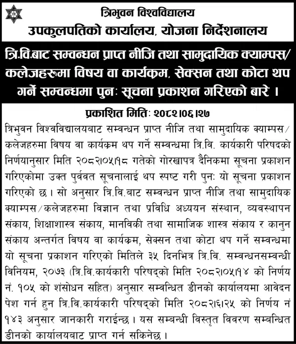This notice has been republished to provide further clarification on details previously released through the Gorkhapatra Daily on 2082/05/18, following the decision made by the Executive Council of Tribhuvan University. The updated notice offers more comprehensive guidelines and explanations for affiliated institutions.